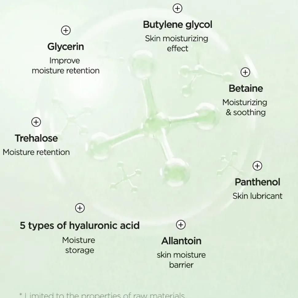 Kasvovoide sisältää runsaasti tehokkaasti rauhoittavaa aloe veraa (80%), rohtosammakonputki-uutetta, pantenolia ja allantoiinia, sekä viittä eri hyaluronihappoa kosteuttamaan- ja luomaan iholle kosteuskalvon.