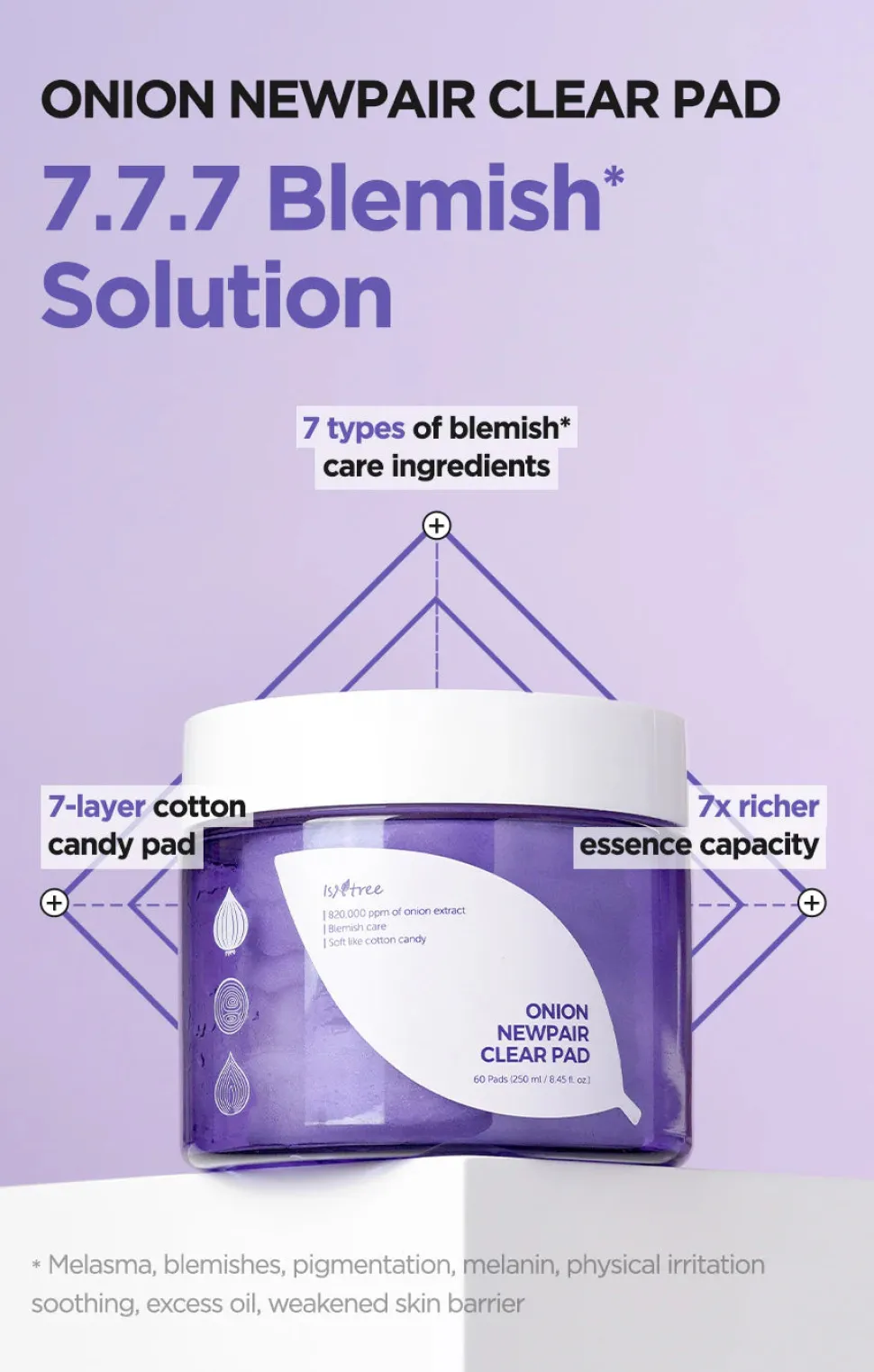 Onion Newpair Clear Pad on osa Isntreen epäpuhtauksiin taipuvan ihon hoitolinjaa, ja se on erinomainen tuote hillitsemään näppylöiden syntyä, nopeuttamaan niiden paranemista ja häiventämään aknearpia sekä hyperpigmentaatiota.