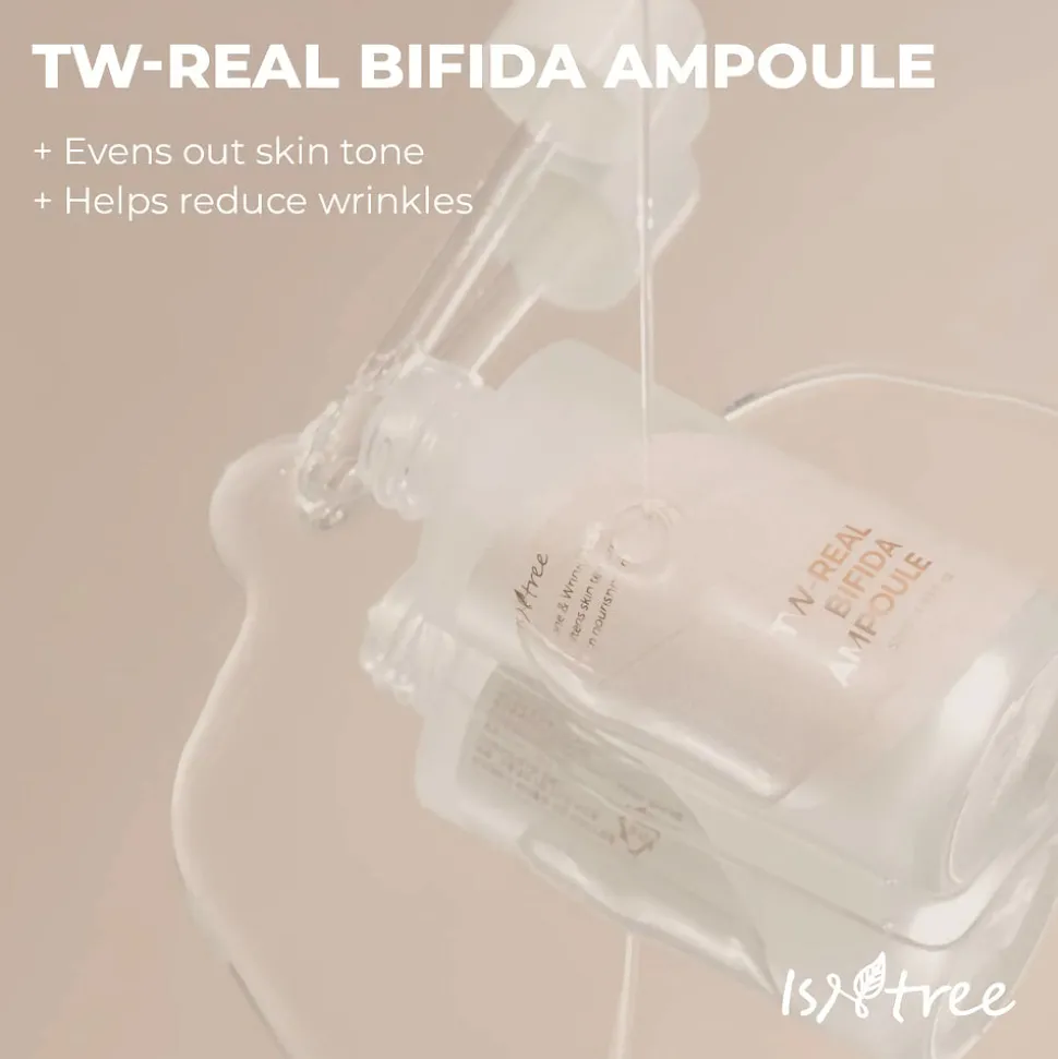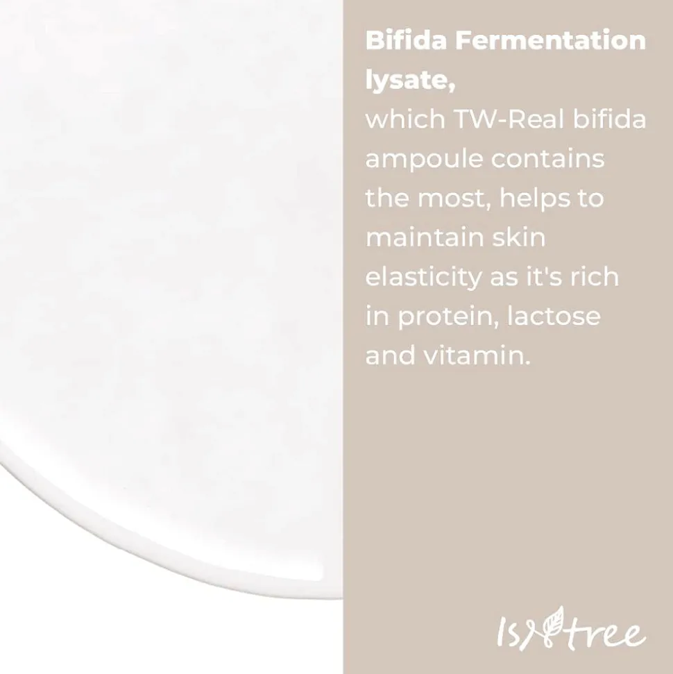 Isntree TW-Real Bifida Ampoule on kosteuttava ja ihon elastisuutta edistävä anti-age ampulli, joka taistelee ihon vaurioita ja ikääntymisen merkkejä vastaan. Tuote sisältää 88% Bifida Ferment Lysate-ainesosaa, joka auttaa ihoa toipumaan UV-säteiden aiheuttamista vaurioista, sekä ennaltaehkäisemään niitä.