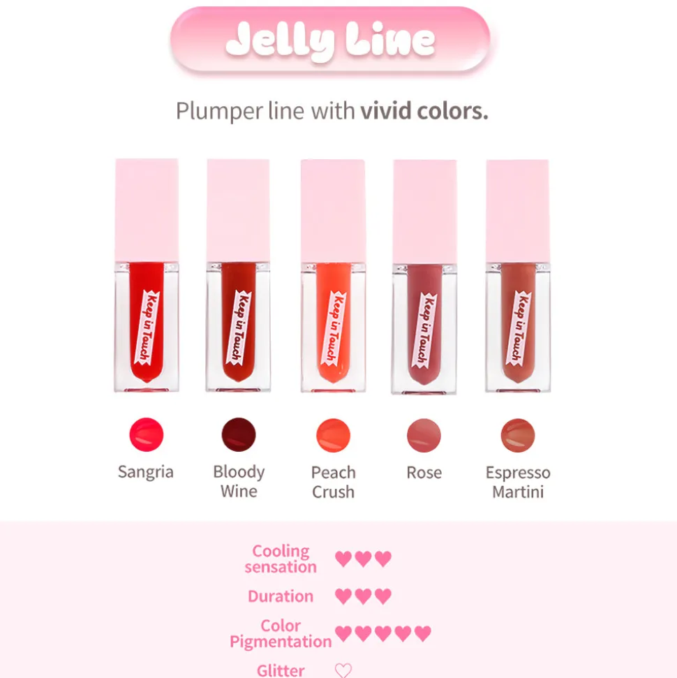 Keep in Touch Jelly Lip Plumper Tint on palkittu, ihoystävällinen ja kosteuttava lip-plumping huulikiilto, jonka hyytelömäinen koostumus luo huulille mehukkaan kiillon ja ihanan täyteläisyyden – ilman huulikiilloille yleensä ominaista tahmaista tunnetta. Lisää kiiltoa huulille joko sellaisenaan tai nosta meikkilookkisi uudelle tasolle levittämällä kiiltoa huulimeikin päälle!