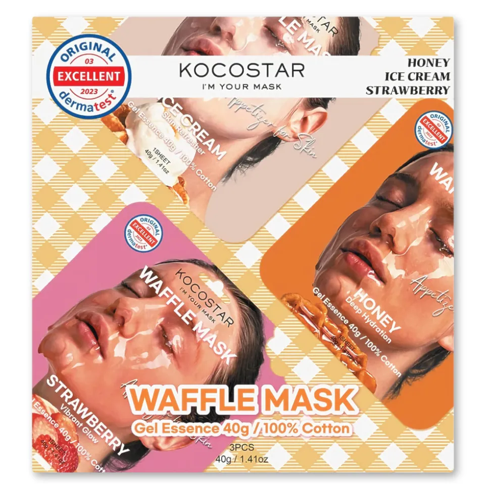 KOCOSTAR Waffle Mask Kit on kaikille ihotyypeille soveltuva kangasnaamiopakkaus, joka sisältää kolme ihoa kosteuttavaa ja rauhoittavaa Waffle Mask -kangasnaamiota. Naamiot sisältävät muun muassa hunaja-, aloe vera- ja rohtosammakonputkiuutetta, jotka yhdessä auttavat ravitsemaan kosteusköyhää ihoa tarjoten sille samalla antioksidantteja.
