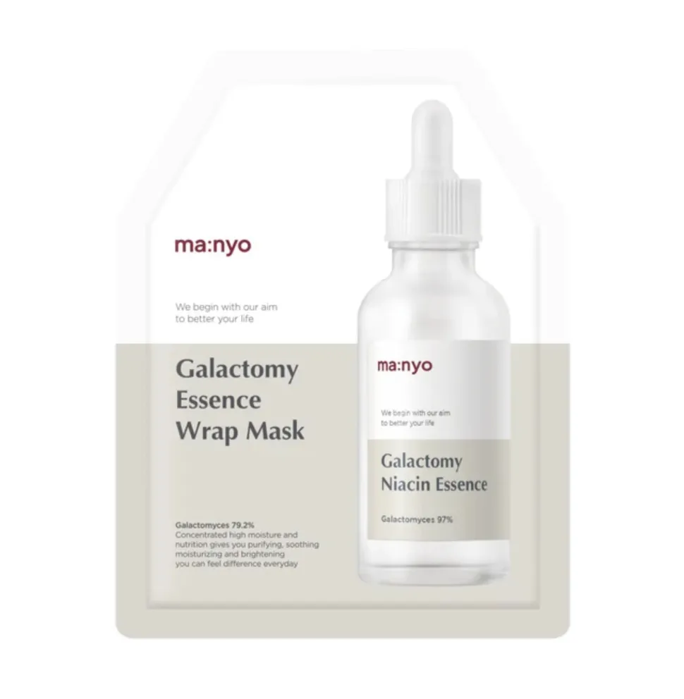Ma:nyo Factory Galactomy Essence Wrap Mask on ihoa kirkastava kangasnaamio, joka sisältää 77,35% fermentoitua Galactomyces -hiivauutetta. Kangasnaamio heleyttää ihoa ja auttaa sen uloimpia kerroksia uusiutumaan nopeammin, jolloin ihon tekstuurista ja sävystä tulee vähitellen tasaisempi.