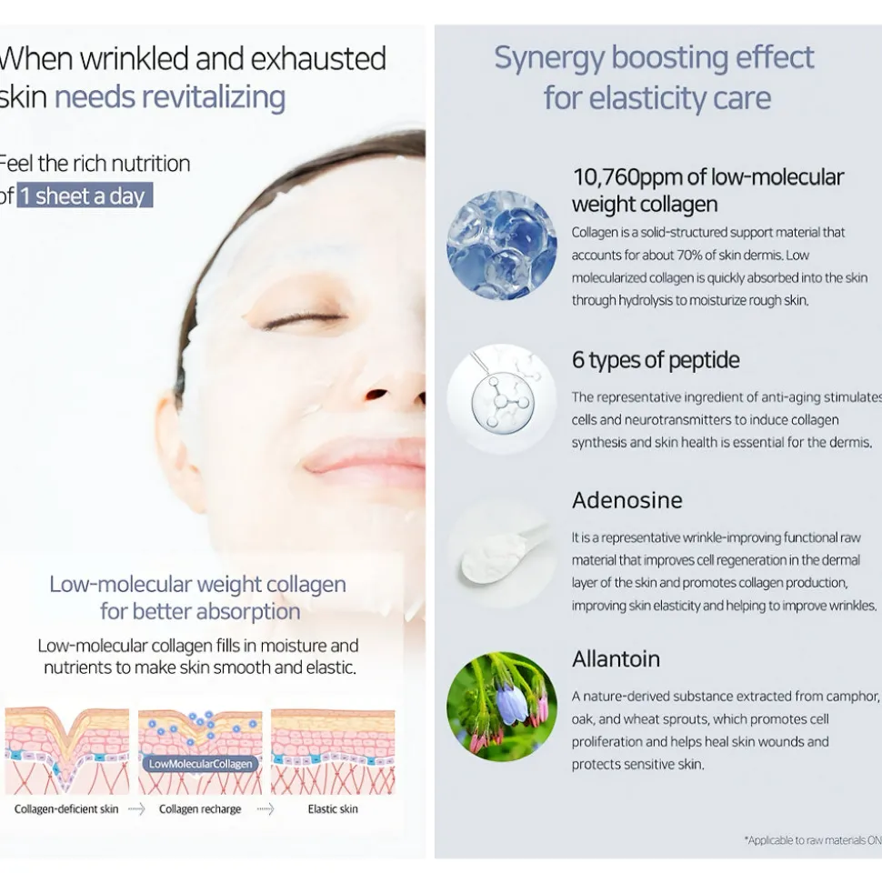 Kangasnaamiot sisältävät tehokkaasti imeytyvää matalan molekyylipainon kollageenia (10,760ppm), ihanteellisen määrän kuutta eri peptidiä, sekä adenosiinia, jotka yhdessä auttavat tukemaan ihon uusiutumiskykyä ja kollageenin tuotantoa, edistäen ihon joustavuutta ja pienten juonteiden häiventymistä. Rikastettu rauhoittavalla allantoiinilla lievittämään ihoärsytystä ja punoitusta.