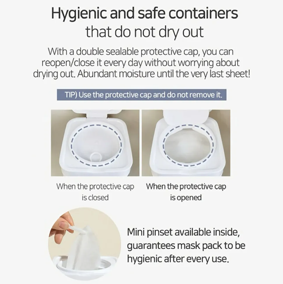 Ohuet ja ihanan pehmeät kangasnaamiot asettuvat iholle napakasti, eivätkä kuivu pakkaukseen käyttöjen välissä – tiiviisti sulkeutuva maskipakkaus sisältää myös pienet pinsetit joiden avulla naamioiden noukkiminen on helppoa ja hygieenistä!