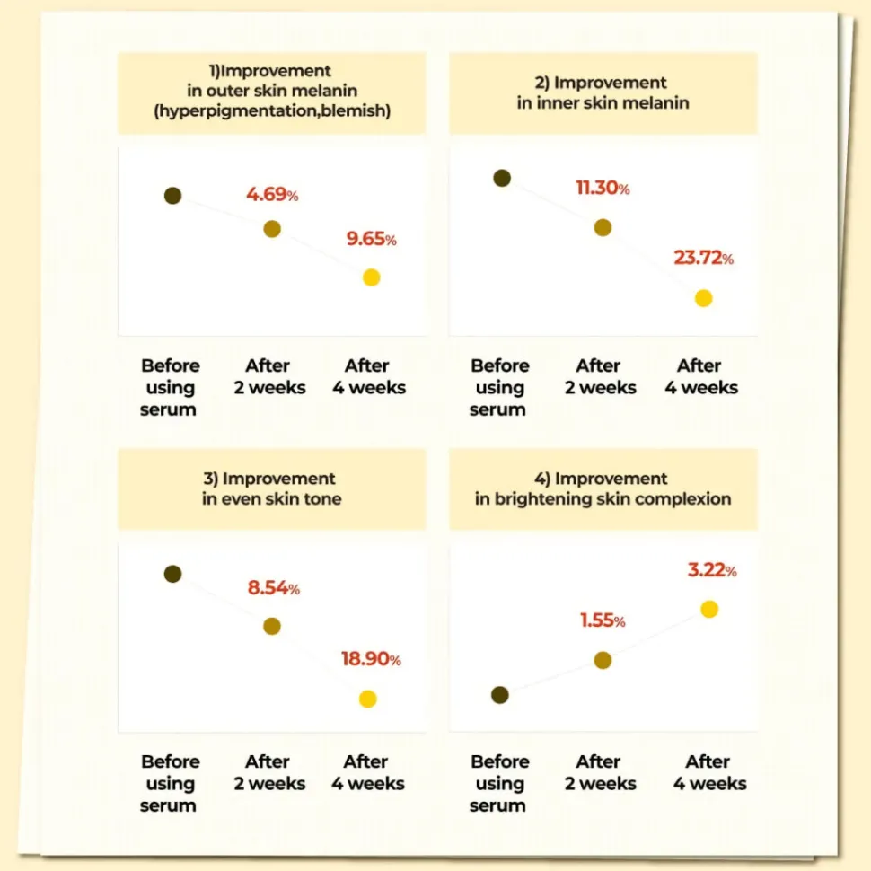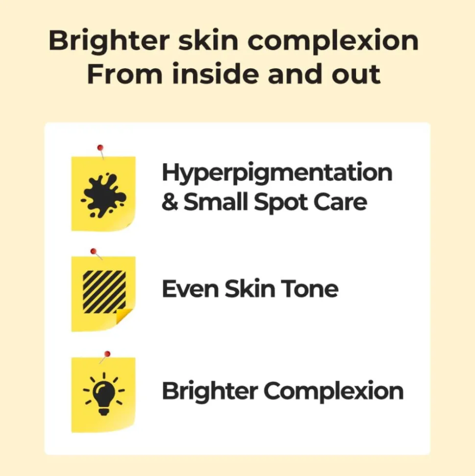 Seerumi sisältää montaa kirkastavien ainesosien superstaraa – glutationia, 5% niasiiniamidia, arbutiinia, sekä puhdasta E-, B- ja C-vitamiinia! Yhdessä traneksaamihapon, kurkuma- ja puolukka-uutteen kanssa seerumin antioksidanttipitoiset ainesosat auttavat edistämään muun muassa hankalien aknearpien vaalenemista ja kirkkaampaa ihon yleisilmettä.