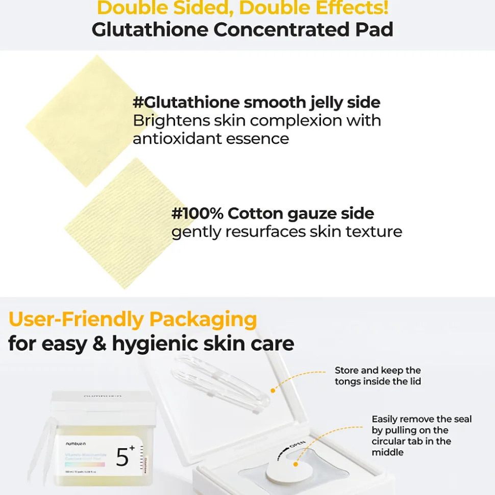 Numbuzin No.5+ Vitamin-Niacinamide Concentrared Pad on ihoa kirkastava antioksidanttipitoinen kasvovesilappu (toner pad) / kuorintalappu (peeling pad) iholle, joka kärsii pigmenttimuutoksista, kuten aknearvista, melasmasta tai auringon aiheuttamista sävymuutoksista. Soveltuu erinomaisesti myös samealle- ja ikääntyvälle iholle.