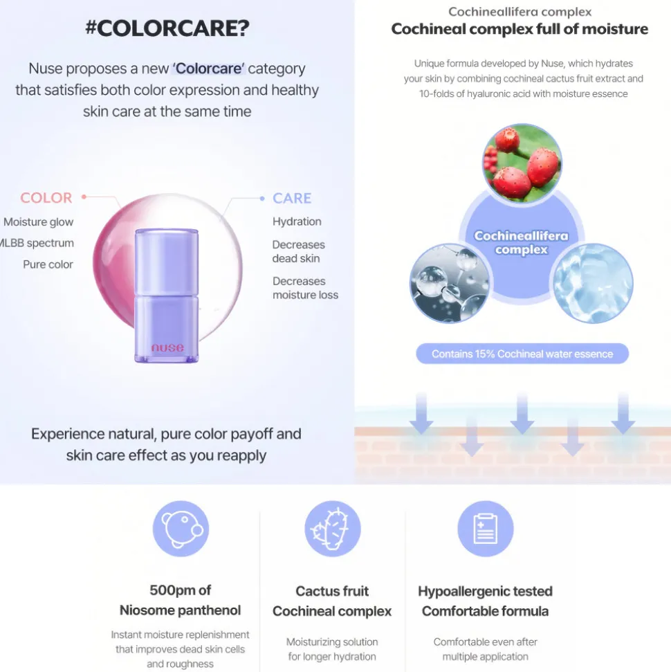 Nuse Care Liptual on vegaaninen ja hypoallergeeninen sävyttävä huuliseerumi / huulisävyte (lip tint), joka luo huulille raikkaan läpikuultavan sävyn ja kastehelmimäisen kiillon. Tämä tehokosteuttava huulisävyte hoitaa kuivaa huulten ihoa kuin seerumi ilman huolta ihoärsytyksestä tai epätasaisesta ja tahmaisesta lopputuloksesta.