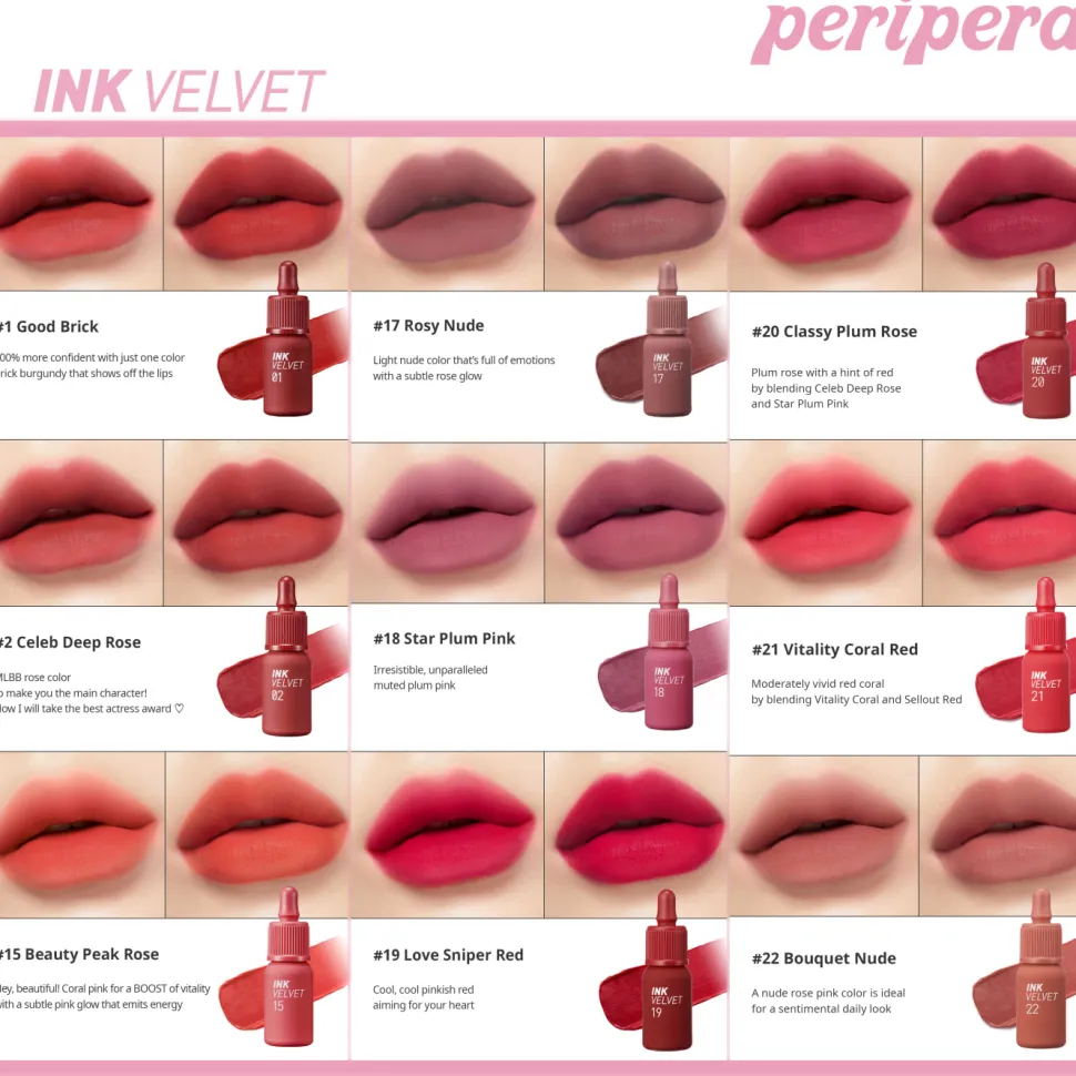 Peripera Ink Velvet Tint on samettisen mattainen – erittäin pigmenttinen ja kestävä – huulisävyte (lip tint) joka levittyy huulille pehmeästi, täyttäen samalla huulten uurteet ja luoden täyteläisen tasaisen samettisen pinnan.