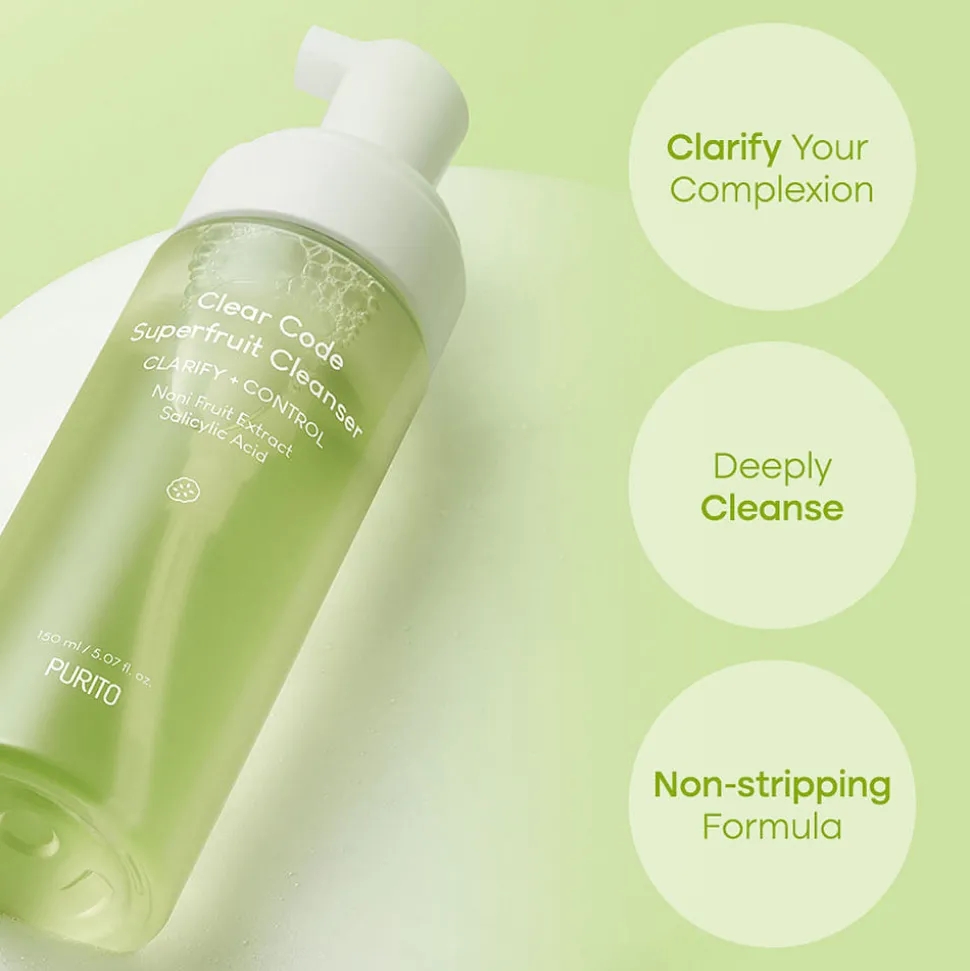 Purito Clear Code Superfruit Cleanser on kasvojen puhdistusvaahto, joka edistää ihon puhtautta ja tasaisuutta. Se hyödyntää superruokanakin tunnettua erittäin vitamiinipitoista noni-hedelmän uutetta ja ihoa hellästi kuorivaa salisyylihappoa.