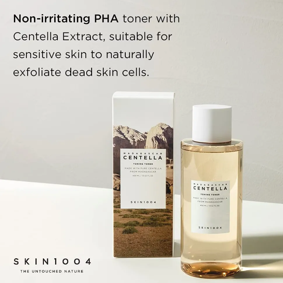 Madagascar Centella Toning Toner on ihoa rauhoittava ja hellävaraisesti kuoriva kasvovesi, joka sisältää PHA-happoa ja rohtosammakonputkiuutetta.