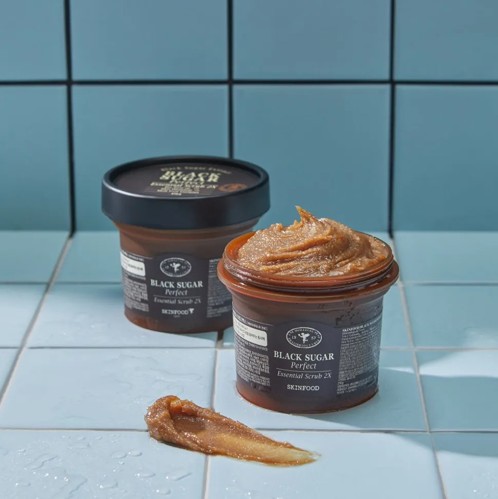 Skinfood Black Sugar Perfect Essential Scrub on ilahduttavan luonnonmukainen tapa kuoria vartalon tai kasvojen ihoa. Kuorintavoide sisältää mm. mustaa sokeria sekä erilaisia kasviöljyjä ja -uutteita, jotka jättävät ihon pehmeäksi ja puhtaaksi sitä samentavilta kuolleilta ihosoluilta, jotka voisivat myös tukkia ihohuokosia. Käytön jälkeen iho tuntuu hyvältä ja näyttää kirkkaammalta.