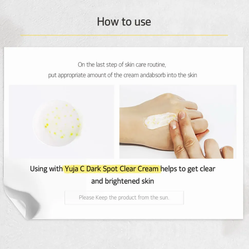 Yuja C Dark Spot Clear Cream on ihoa kirkastava ja kosteuttava voide, joka sisältää yuja hedelmän uutetta ja niasiiniamidia.