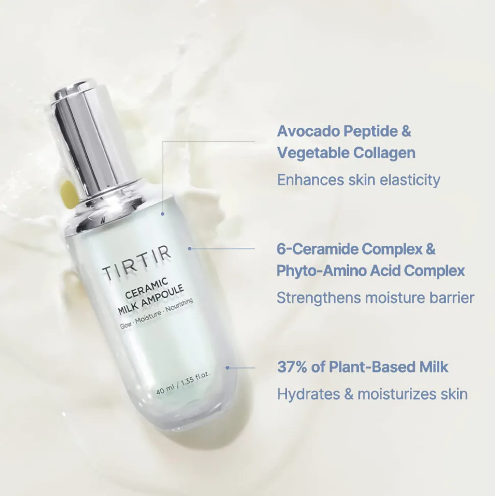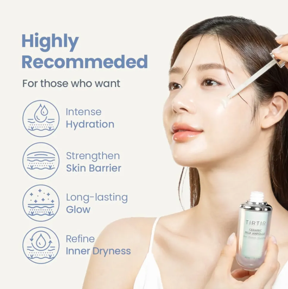 TIRTIR Ceramic Milk Ampoule on hellävarainen, ihoa tehokosteuttava, vahvistava ja sen kimmoisuutta edistävä ampulli etenkin kuivalle, ikääntyvälle ja herkälle iholle – ja sinulle kuka haluat saavuttaa pitkäkestoisen kosteutuksen lisäksi lasimaisen glass skin -ihon ilman tahmaista tunnetta!