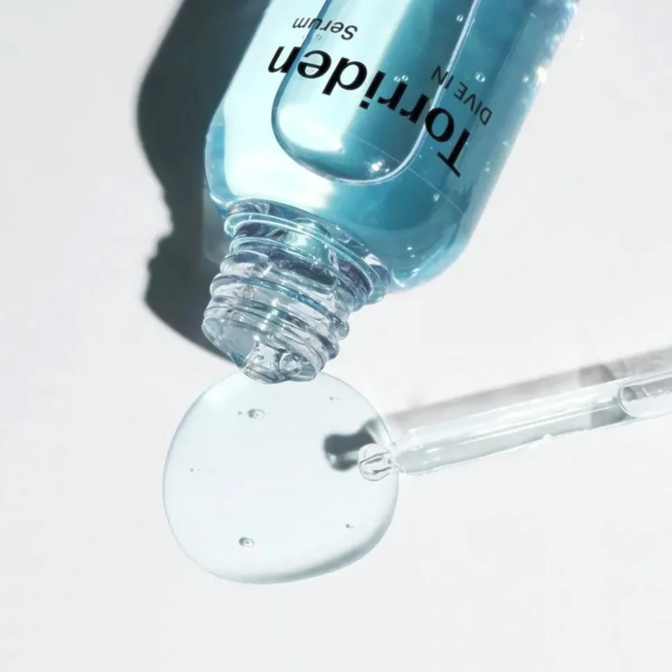 Torriden DIVE-IN Hyaluronic Acid Serum on ihoa tehokkaasti kosteuttava ja rauhoittava seerumi, joka sisältää pienimolekyylistä hyaluronihappoa, allantoiinia, pantenolia sekä muita rauhoittavia ainesosia.
