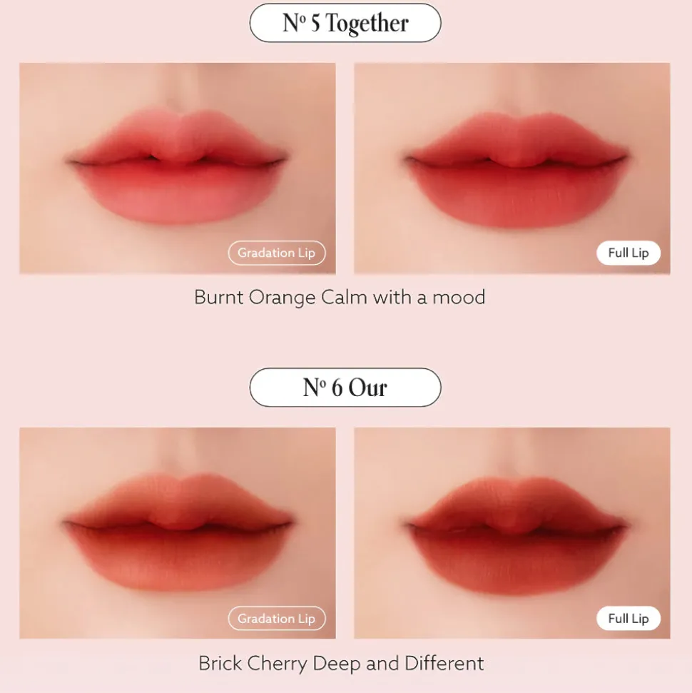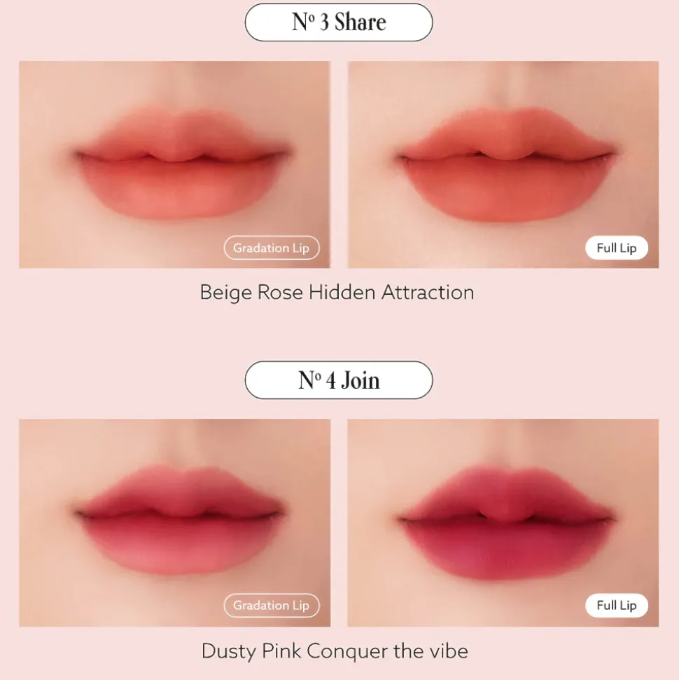 [N°2 MINGLE]Dimethicone, Dimethicone/Vinyl Dimethicone Crosspolymer, Polyglyceryl-2 Triisostearate Isododecane, Dimethicone Crosspolymer, Titanium Dioxide (CI 77891), Trimethylsiloxysilicate, Cetyl PEG/PPG-10/1 Dimethicone, Water, Yellow 5 (CI 19140), Red 27 (CI 45410),Yellow 6 (CI 15985), Iron Oxide Red (CI 77491), 1,2-Hexanediol, Disteardimonium Hectorite, Red 6 (CI 15850), Phenoxyethanol, Red 7 (CI 15850), Fragrance, Propylene Carbonate, Ethylhexylglycerin, Aluminum Hydroxide, Diisostearyl Malate, Iron Oxide Black (CI 77499), Mangifera Indica (Mango) Seed Butter, Olea Europaea, (Olive) Fruit Oil, Orbignya Oleifera Seed Oil [N°3 SHARE]Dimethicone, Dimethicone/Vinyl Dimethicone Crosspolymer, Dimethicone Crosspolymer, Isododecane, Polyglyceryl-2 Triisostearate Titanium Dioxide (CI 77891), Trimethylsiloxysilicate, Cetyl PEG/PPG-10/1 Dimethicone, Water, Yellow 6 (CI 15985), 1,2-Hexanediol Iron Oxide Yellow(CI 77492), Disteardimonium Hectorite, Phenoxyethanol, Red 7 (CI 15850), Iron Oxide Black (CI 77499), Fragrance Iron Oxide Red (CI 77491), Diisostearyl Malate, Propylene Carbonate, Ethylhexylglycerin, Aluminum Hydroxide, Orbignya Oleifera Seed Oil Mangifera Indica (Mango) Seed Butter, Olea Europaea (Olive) Fruit Oil [N°4 JOIN]Dimethicone, Dimethicone/Vinyl Dimethicone Crosspolymer, Dimethicone Crosspolymer, Isododecane, Polyglyceryl-2 Triisostearate, Trimethylsiloxysilicate, Cetyl PEG/PPG-10/1 Dimethicone, Water, Titanium Dioxide (CI 77891), Iron Oxide Red (CI 77491), Red 7 (CI 15850), Disteardimonium Hectorite, 1,2-Hexanediol, Fragrance, Phenoxyethanol, Propylene Carbonate, Iron Oxide Black (CI 77499), Diisostearyl Malate, Iron Oxide Yellow (CI 77492),Aluminum Hydroxide, Ethylhexylglycerin, Orbignya Oleifera Seed Oil, Mangifera Indica (Mango) Seed Butter, Olea Europaea (Olive) Fruit Oil [N°5 TOGETHER]Dimethicone, Dimethicone/Vinyl Dimethicone Crosspolymer, Dimethicone Crosspolymer, Polyglyceryl-2 Triisostearate, Isododecane, Titanium Dioxide (CI 77891), Trimethylsiloxysilicate, Water, Cetyl PEG/PPG-10/1 Dimethicone, Yellow 6 (CI 15985), Iron Oxide Red (CI 77491), Iron Oxide Yellow (CI 77492), 1,2-Hexanediol, Red 7 (CI 15850), Disteardimonium Hectorite, Phenoxyethanol, Fragrance, Yellow 5 (CI 19140), Propylene Carbonate Ethylhexylglycerin, Diisostearyl Malate, Iron Oxide Black (CI 77499), Aluminum Hydroxide, Olea Europaea (Olive) Fruit Oil, Orbignya Oleifera Seed Oil, Mangifera Indica (Mango) Seed Butter [N°6 OUR]Dimethicone, Dimethicone/Vinyl Dimethicone Crosspolymer, Dimethicone Crosspolymer, Isododecane, Polyglyceryl-2 Triisostearate, Trimethylsiloxysilicate, Water, Cetyl PEG/PPG-10/1 Dimethicone, Iron Oxide Red (CI 77491), Yellow 6 (CI 15985), Iron Oxide Yellow(CI 77492), Red 7 (CI 15850), 1,2-Hexanediol, Diisostearyl Malate, Iron Oxide Black (CI 77499), Disteardimonium Hectorite, Phenoxyethanol, Fragrance, Propylene Carbonate, Ethylhexylglycerin, Olea Europaea (Olive) Fruit Oil, Orbignya Oleifera Seed Oil, Mangifera Indica (Mango) Seed ButterJos tuotteen koostumuksessa on tapahtunut/käynnissä muutoksia, saattavat tuotteiden ainesosat erota sivuilla ilmoitetusta. Joissain tapauksissa sivuilla voi myös olla esillä korealainen ainesosaluettelo, jolloin ainesosat on ilmoitettu eri järjestyksessä. Tarkista aina viimeisimmät ainesosat suoraan pakkauksesta tai ota yhteyttä asiakaspalveluumme.