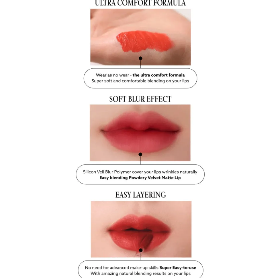 Hug Velvet Tint on vegaaninen huulisävyte, joka jättää pitkäkestoisen mattaisen ja blurratun näköisen lopputuloksen. Samettinen mutta kosteuttava koostumus ei tunnu huulilla melkein ollenkaan.