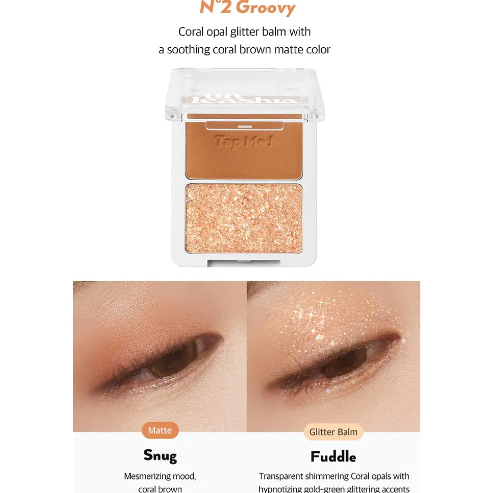 Unleashia Tap Me Palette Duo on kompakti vegaaninen kahden sävyn luomiväripaletti, jossa on sekä syvä, mattapintainen luomiväri että kimalteleva glitter-sävy.